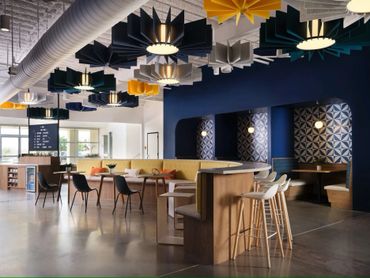 Soluciones acústicas que además de reducir la reverberación y el ruido, integran iluminación, ya sea decorativa o funcional.